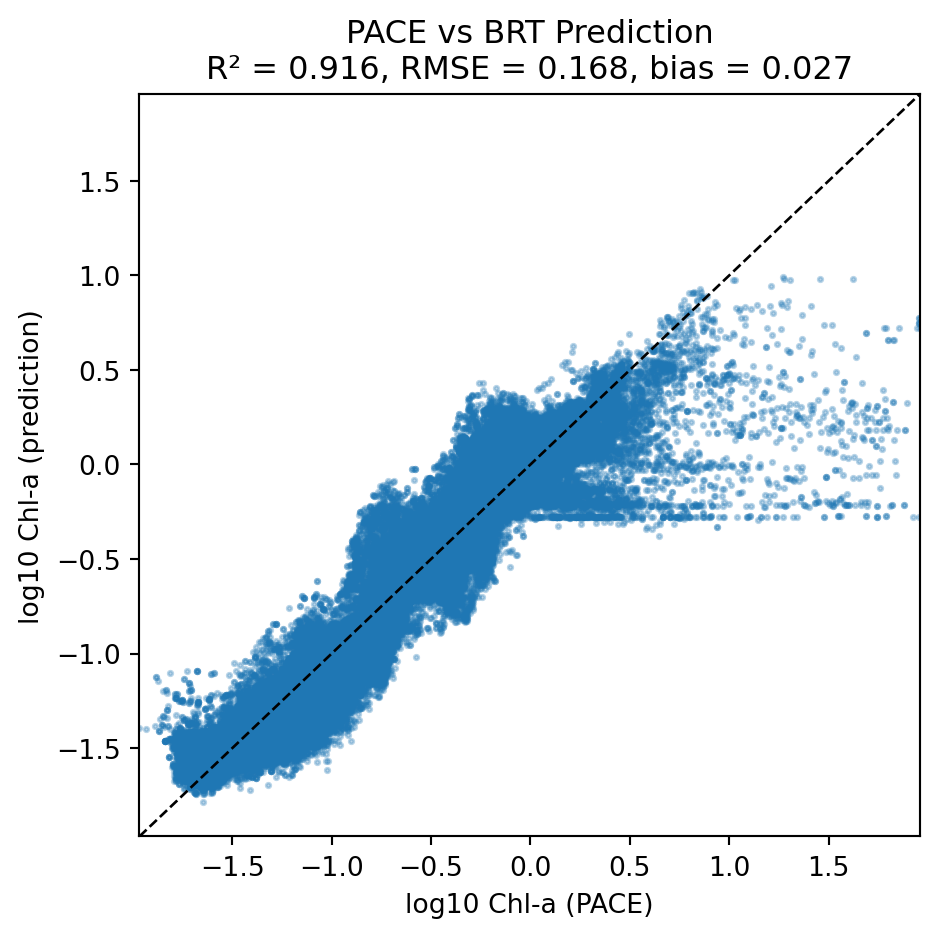 We do not expect these to be identical as the PACE chlor_a is based on the classic Rrs ratio algorithm while the BRT uses the whole spectrum but most importantly was trained on Argo and OOI florometer measurements.
