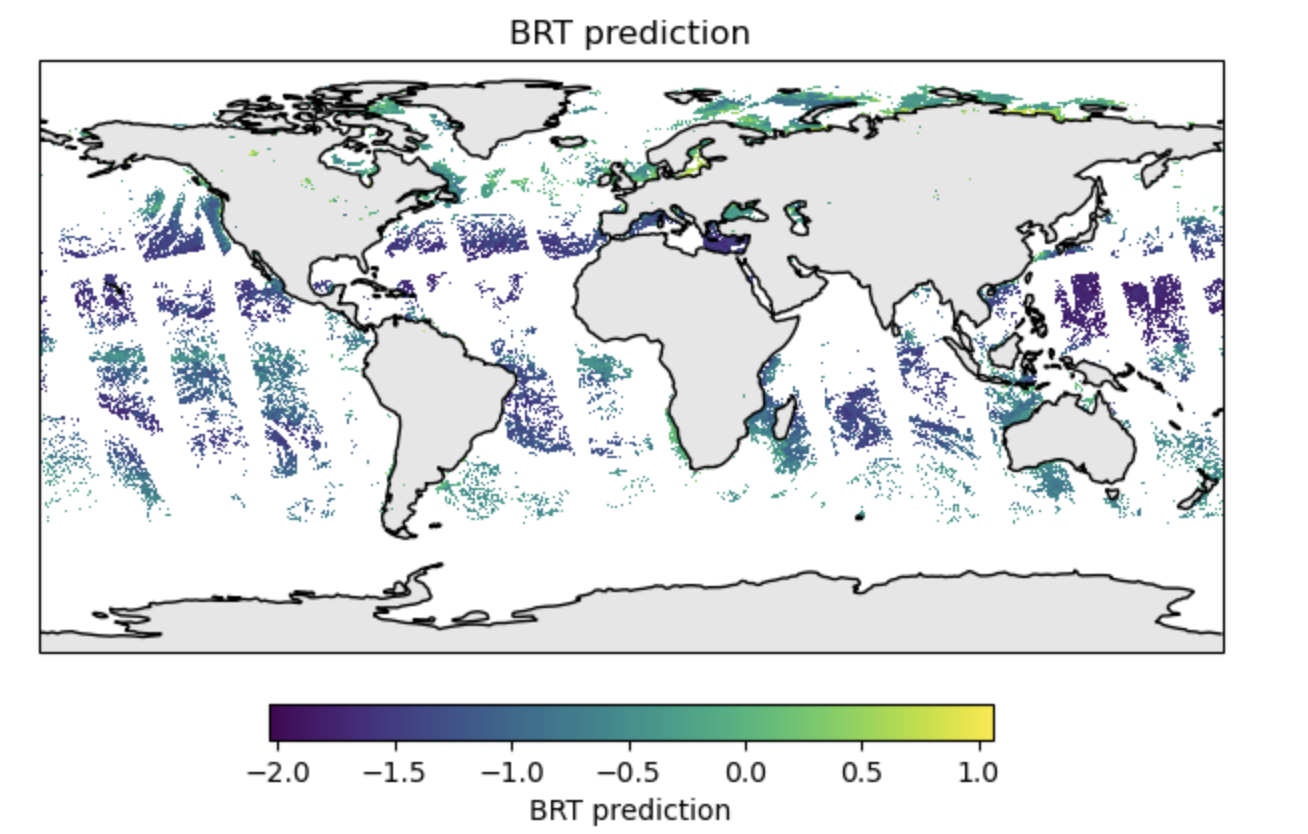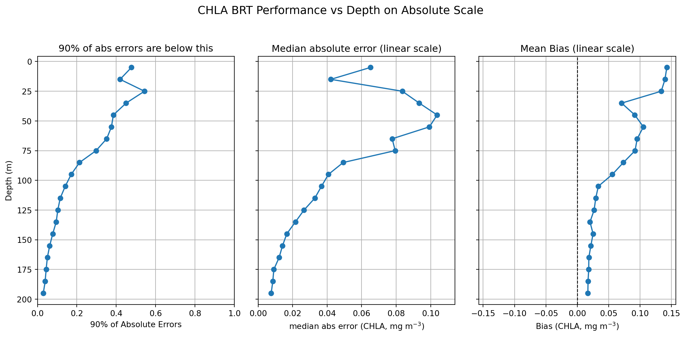 sklearn HistGradientBoostingRegressor() function. Standard. Easy.Each model predicts CHLA in a single depth range: